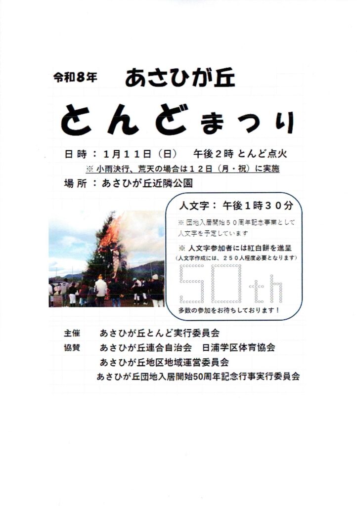 令和8年1月11日(日)荒天の場合12日(月・祝) あさひが丘とんどまつり開催